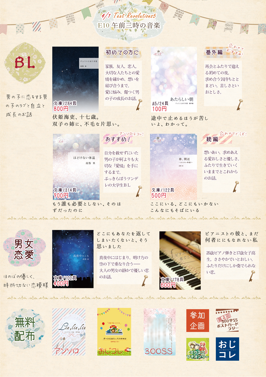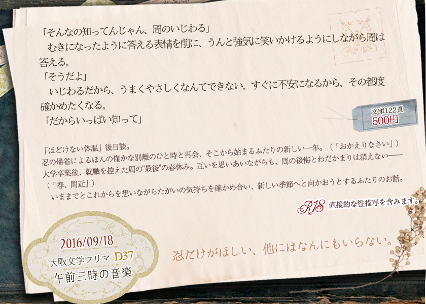 恐らくこれしか読めない、作風が違うけど書いたのはわたし、と好き放題言われている(ほんとうに)なんですがとても大切に書いたお気に入りの一冊です。