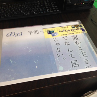 まず、A2サイズで原稿作り これを元にA3分割データを作って、画像が切れないように97パーセントくらい縮小→ポスター上・下みたいなファイル名でPDFにしてUSBメモリに入れます。