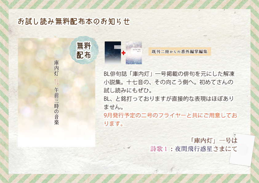 BL俳句誌「庫内灯」一号掲載のBL俳句を元にした掌編小説集です。