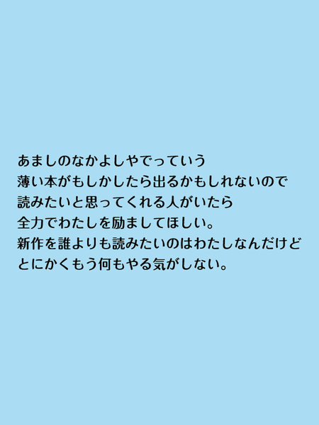 なにも書けないし書きたくない、なにも出来ない、と痛感した10月頃、商業でお仕事をさせてもらっていないから本を身近な場所で手にとって貰えることもないし、アンソロや合同誌のお誘いがあるわけでもない=「すこし小説が書ける」だけなことがなんだかすごくつまらなく思えてしまいました。