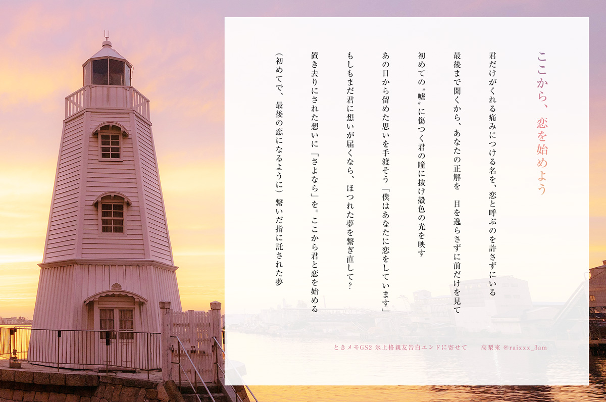 まるで星の落ちる夜のような、恋をときメモGS2にはまった事をきっかけに二次短歌の連作がいくつか出来たので、それらとともに、ゲームを未プレーの方向けの「わたしとGS、というか氷上くんとわたしの恋」についての一言コラムを載せた本をまとめました。