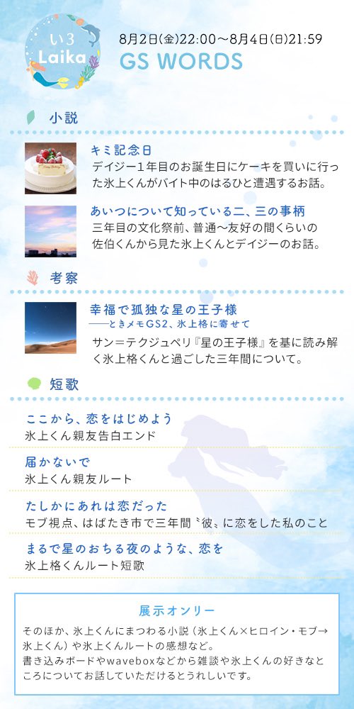 GS2に関しては氷上くんの親友モードを考察する勉強会でみなさんと考えや気づきを共有させていただいたり、お誕生日カウントダウン企画でたくさんの人にお話を読んでいただける機会をいただけたり、イベントでアンドロメダ姫(氷上くんファンの呼称)とリアルでお会いする機会に恵まれたりと、はまりたてのジャンルかつ、みなさんのように専用アカウントを作って交流しようというつもりはまったくなかったのになぜ!? という勢いで(笑)多数のあたたかな交流の機会に恵まれ、非常に感謝しています。