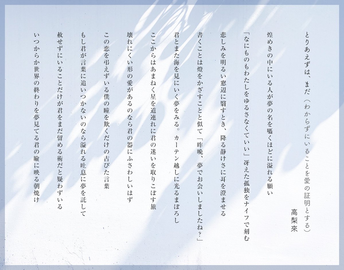 短歌は心に大きなショックを受けた時に偶然の産物として生まれるもの=日常的な創作活動として行うことが出来ないため、投稿や歌会などへの参加は出来ない=短歌クラスタではないなという気持ちでいるのですが、目に留めてくださる方がいらっしゃることがとてもうれしいです。