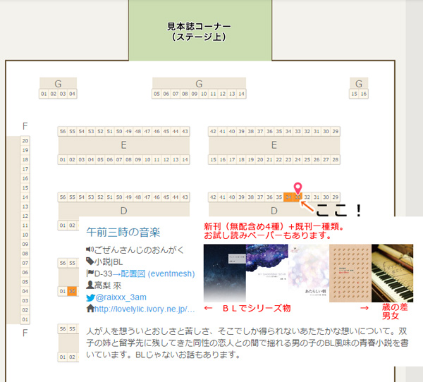 eventmeshに大阪文フリの配置が出ています。 午前三時の音楽はD-33、お隣は