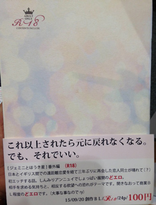BL好きです、書いてますってお声を掛けて下さったサークルさんがいらしたのもすごく楽しかったです。みんな、BL書こう!(笑)