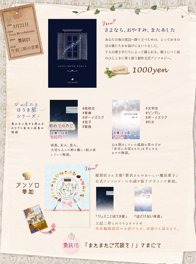次回の予定は、3/21のテキレボ8に委託参加させていただきます。