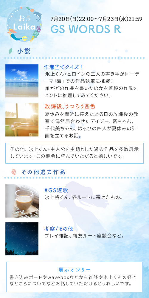 わたしが出したのは後述する企画作品での氷上くんとヒロインちゃんのお話と、女の子同士でワイワイ夏休みの計画を立てるお話。
