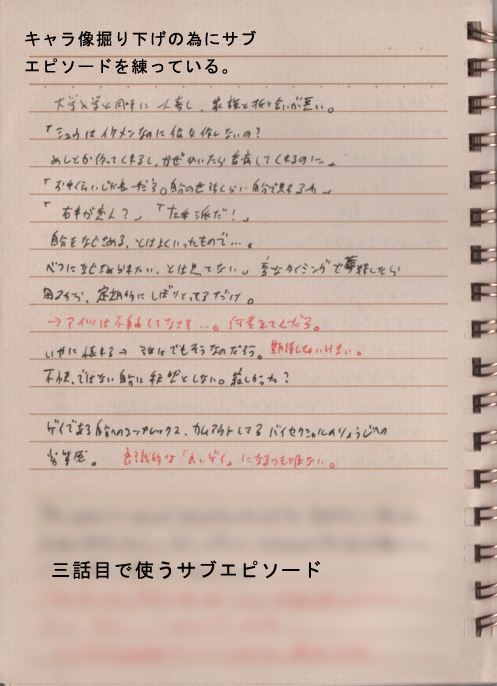 主人公周のキャラクター像を固める為に、 人間像がつたわるサブエピソードを練っている。