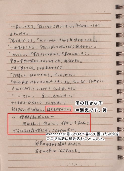 →大抵キャラクターから浮かぶので、キャラ像と、彼らの起こしそうな感情のやり取りを頭の中で考えて(わたしの意思とは関係なく奴らは勝手に動き回りやがる)、思いついた会話ややり取りなどがあればiPhoneからエバーノートにメモしておく。