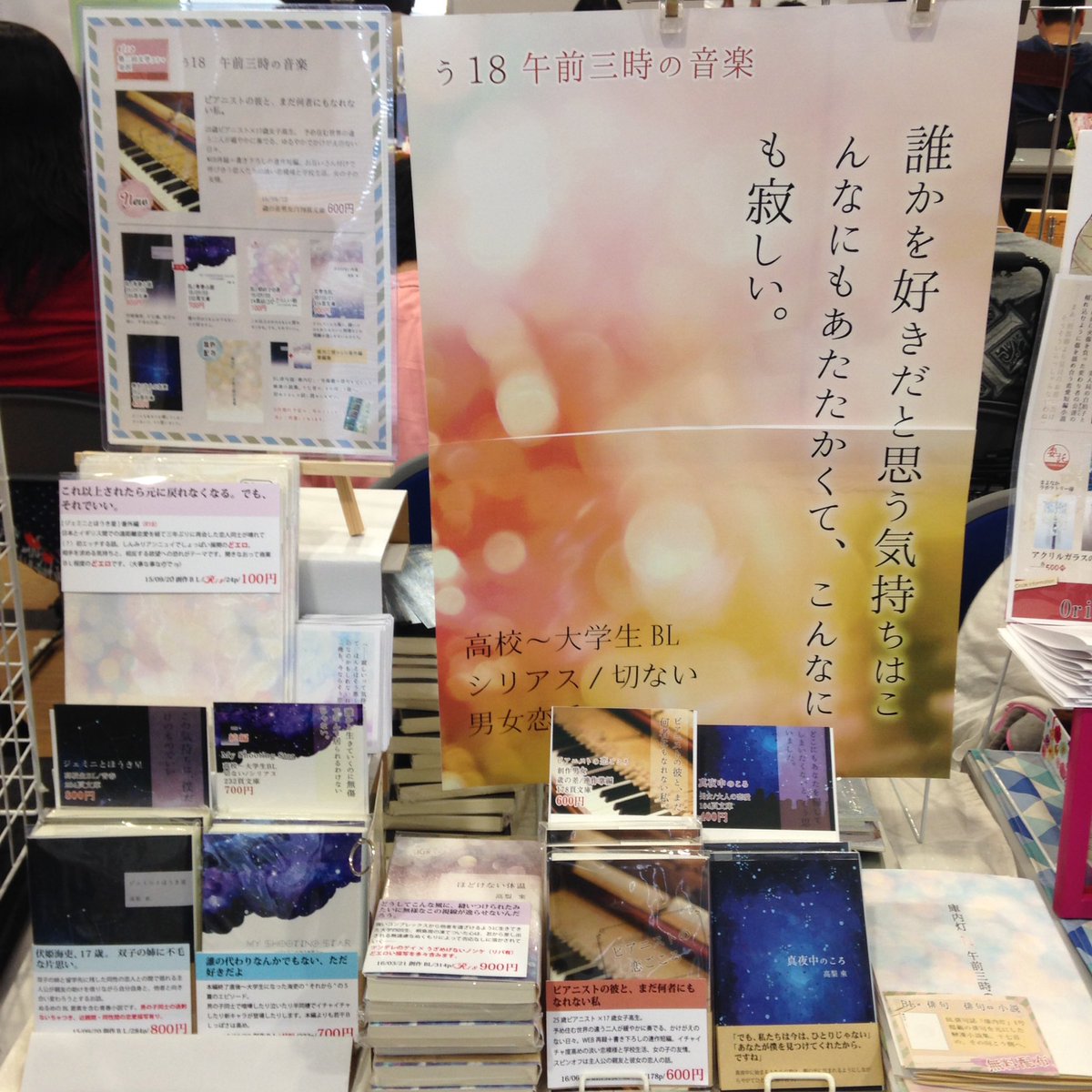 あと、ツイッターにも書いたからぶっちゃけて言うと初めて自分で手売りした(過去二回委託だったから)「ほどけない体温」が…出なくて…。