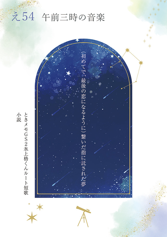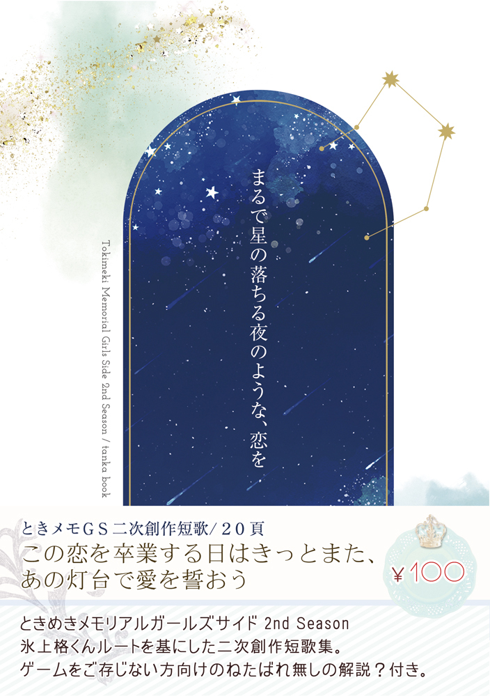 まるで星の落ちる夜のような、恋をときメモGS2にはまった事をきっかけに二次短歌の連作がいくつか出来たので、それらとともに、ゲームを未プレーの方向けの「わたしとGS、というか氷上くんとわたしの恋」についての一言コラムを載せた本をまとめました。