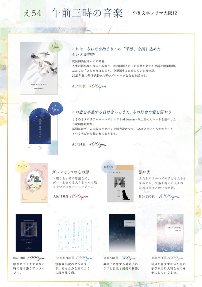 新刊がないとつまらないけれど、体力・精神力的に大きな企画を打ち出すのは難しいし、4年前に文フリ大阪で出すはずだった大切な本を改めてイベントで見てもらうことに注力したいと思い、新刊はコピー本二冊でした。